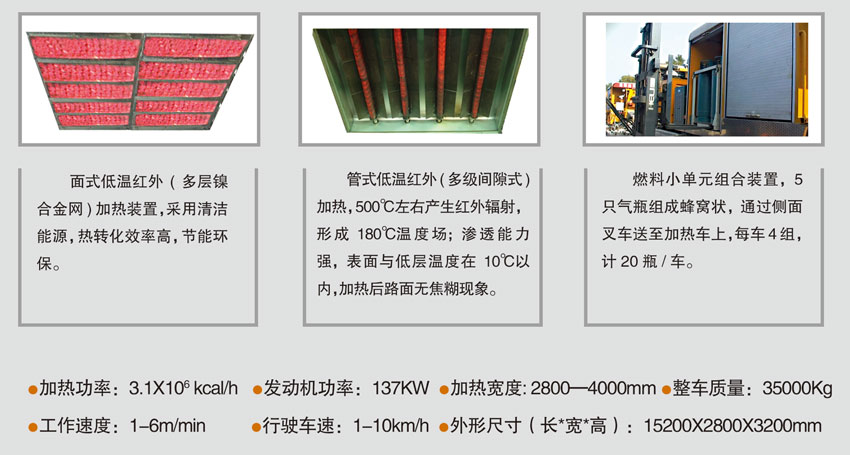 熱傳遞方式主要通過:低溫紅外(網式+管式)多級間隙式柔和麻豆视频在线观看免费网站技術,其次采用全車身覆蓋保溫,使全車麻豆视频在线观看免费网站溫度場保持在180℃ ,有效麻豆视频在线观看免费网站深度達麵層下10cm。